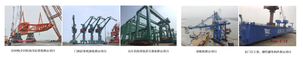公司承运多种大型港机设备(如:门座机、场桥机、岸桥机、堆取料机、卸桥机等)的移运、转场、拆卸、安装;专业的操作团队,对重心、重力、风速、同步性操作精准到位,技术成熟,服务周到,其自主研发的移运辅助工装为业内首创,在行业内赢得广泛的认可与赞誉。